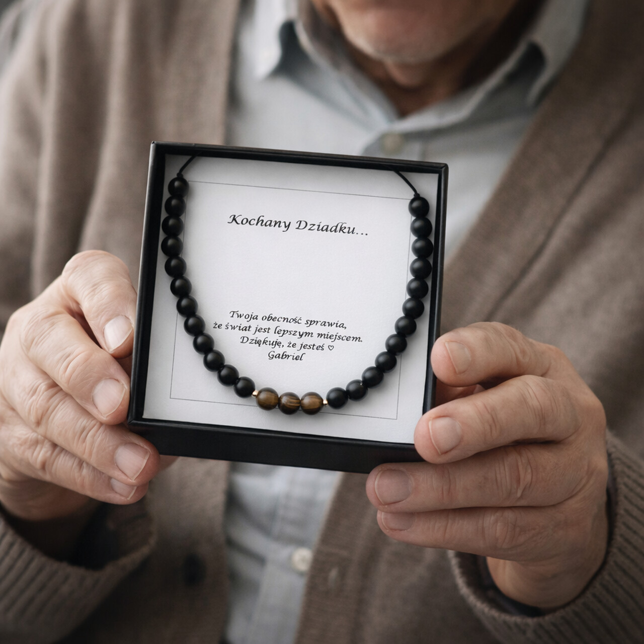 Bransoletka posiada regulację, dlatego masz gwarancję, że będzie pasować na dłoń Twojego dziadka.