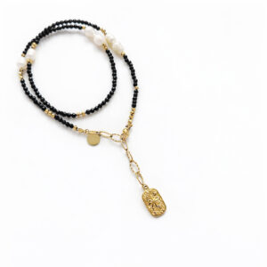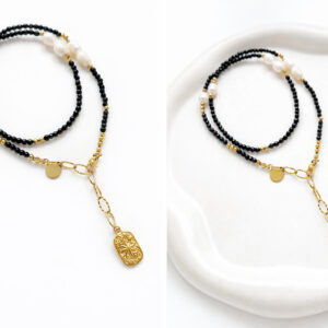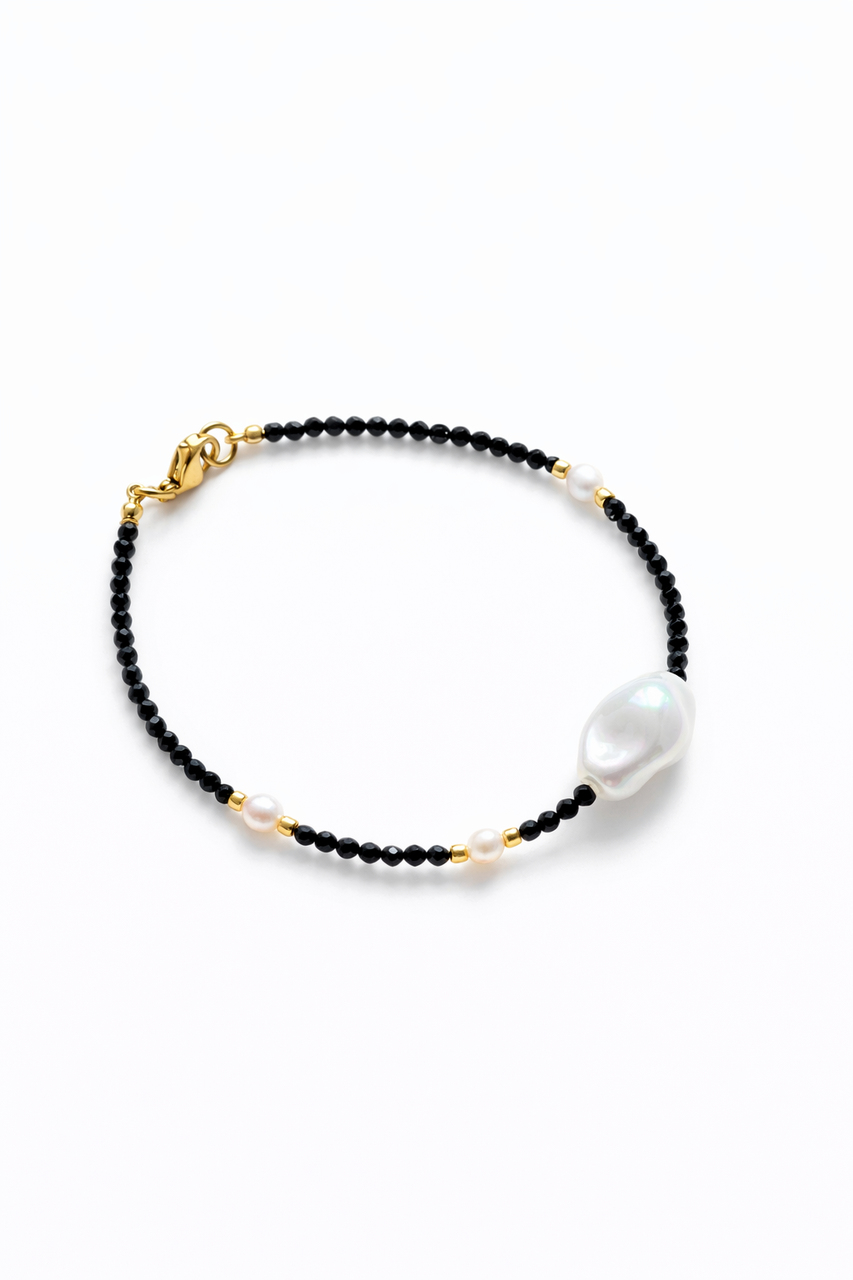 Klasyczna, ponadczasowa bransoletka z czarnego turmalinu oraz perły hodowlanej. Centralnym elementem jest większa perła, która nadaje całości elegancki i subtelny charakter.