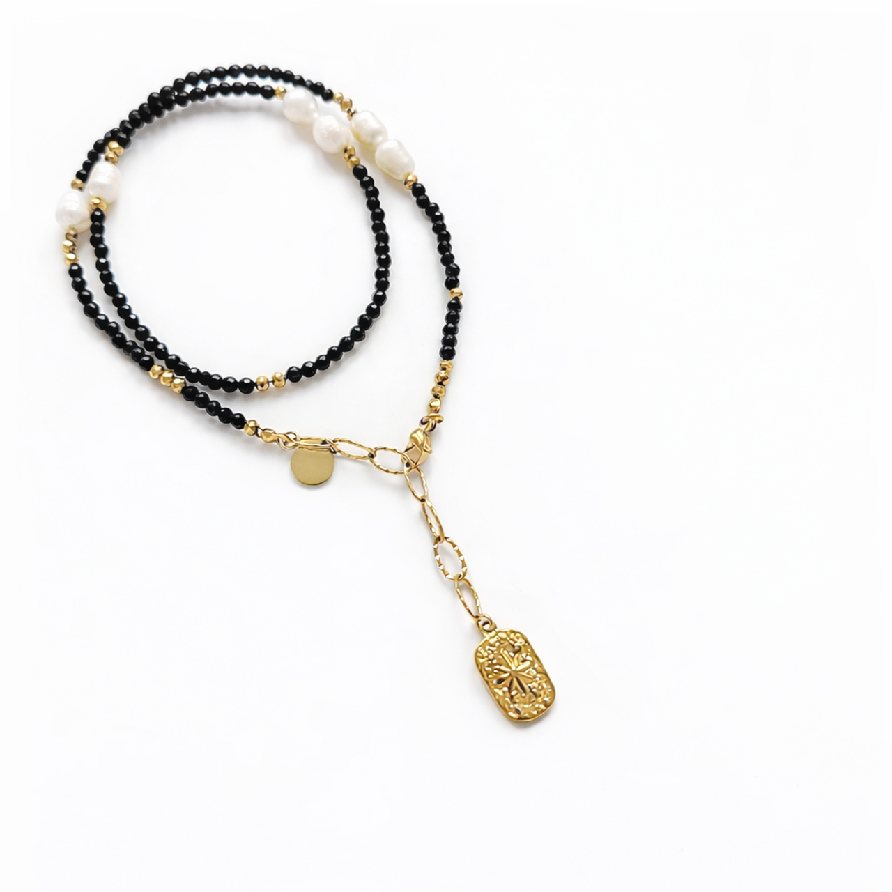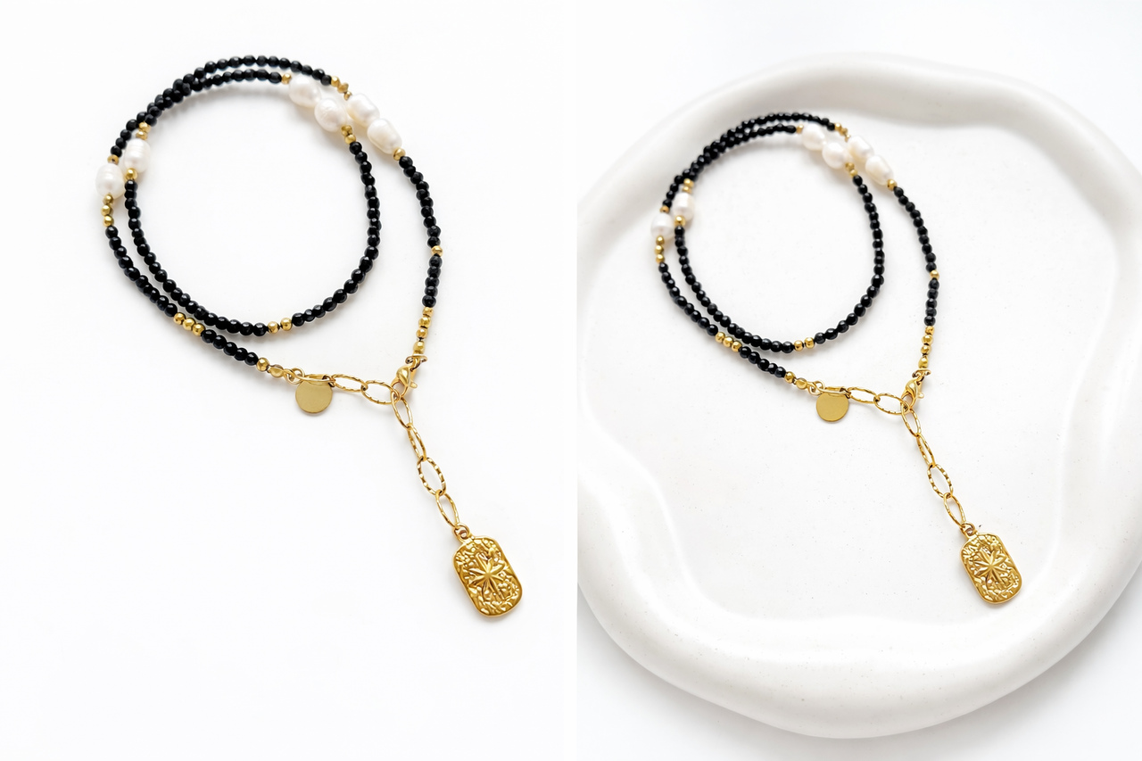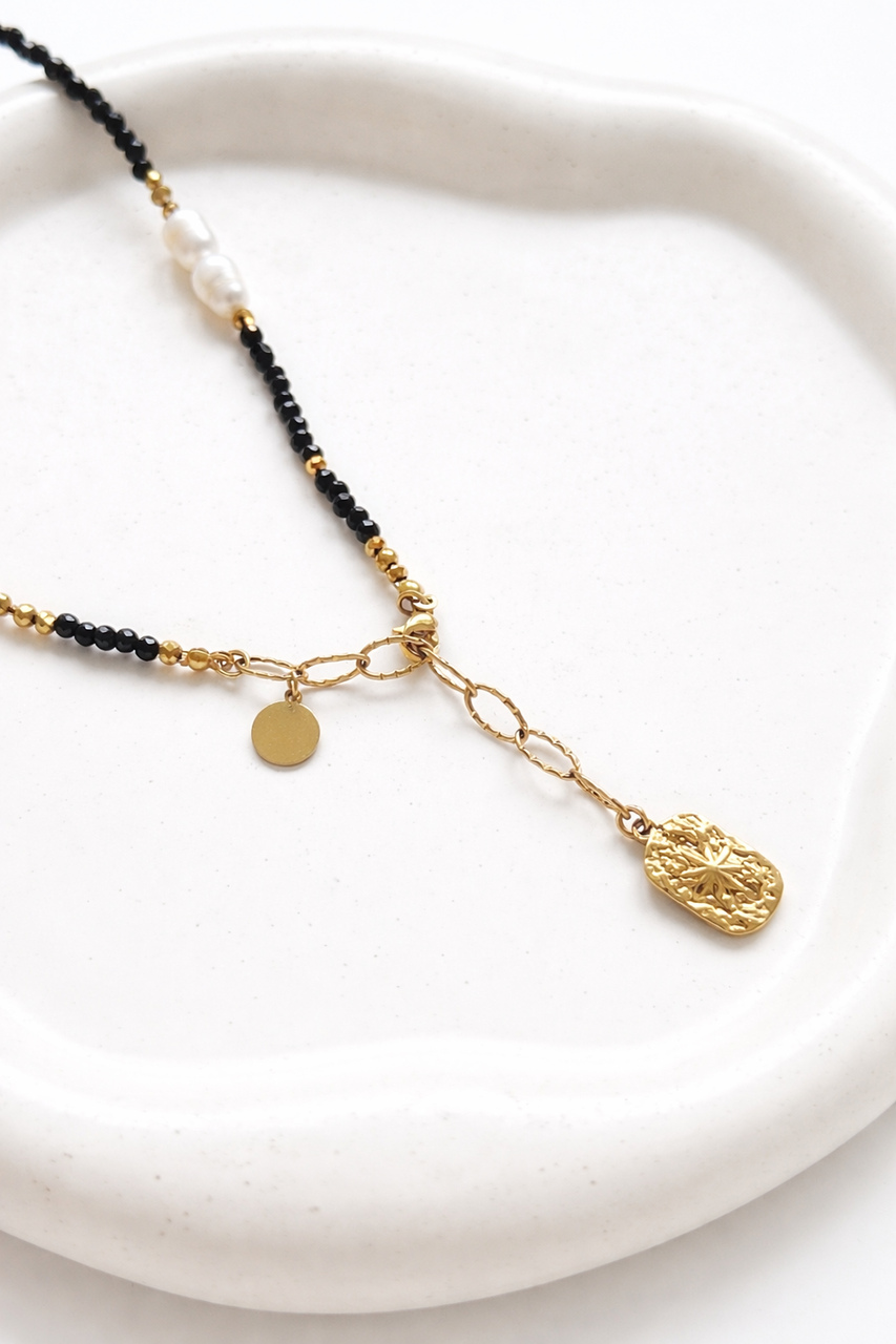 Połączenie czerni onyksu i delikatnego blasku perły sprawia, że naszyjnik idealnie pasuje zarówno do minimalistycznych stylizacji, jak i eleganckich, wieczorowych zestawów.