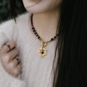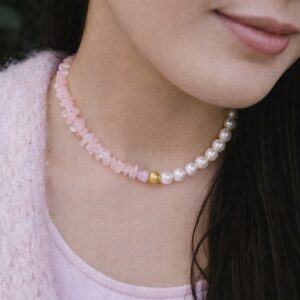 Modelka ma na sobie długość 42 cm. Do każdego naszyjnika dodana jest przedłużka – umożliwiająca regulację.